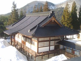 二月下旬・春一番が吹き渡った後、暖かい日差しを受ける本堂